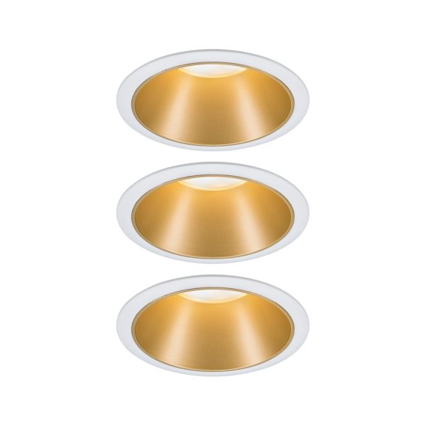 Liebe auf den zweiten Blick! Die Einbauleuchten Cole in Weiß/Gold verschmelzen durch die zurückgesetzten Leuchtmittel nahezu mit der Decke. Hat man sie aber entdeckt, möchte man gar nicht mehr wegschauen. Das Licht der zurückgesetzten Coins auf der matten, goldenen Oberfläche, sorgt für weiche und blendfreie Beleuchtung. Zusätzlich punkten sie mit brillanter Technik: Die wechselbaren LED Coins liefern angenehm warmweißes Licht und lassen sich mit einem herkömmlichen Lichtschalter in drei Stufen dimmen. Mit handelsüblichem Lichtschalter in 3-Stufen dimmbar Inkl. auswechselbarem LED Leuchtmittel Farbtemperatur: 2700K - Warmweiß IP-Schutz: IP44 - spritzwassergeschützt Für den 230V-Direktanschluss