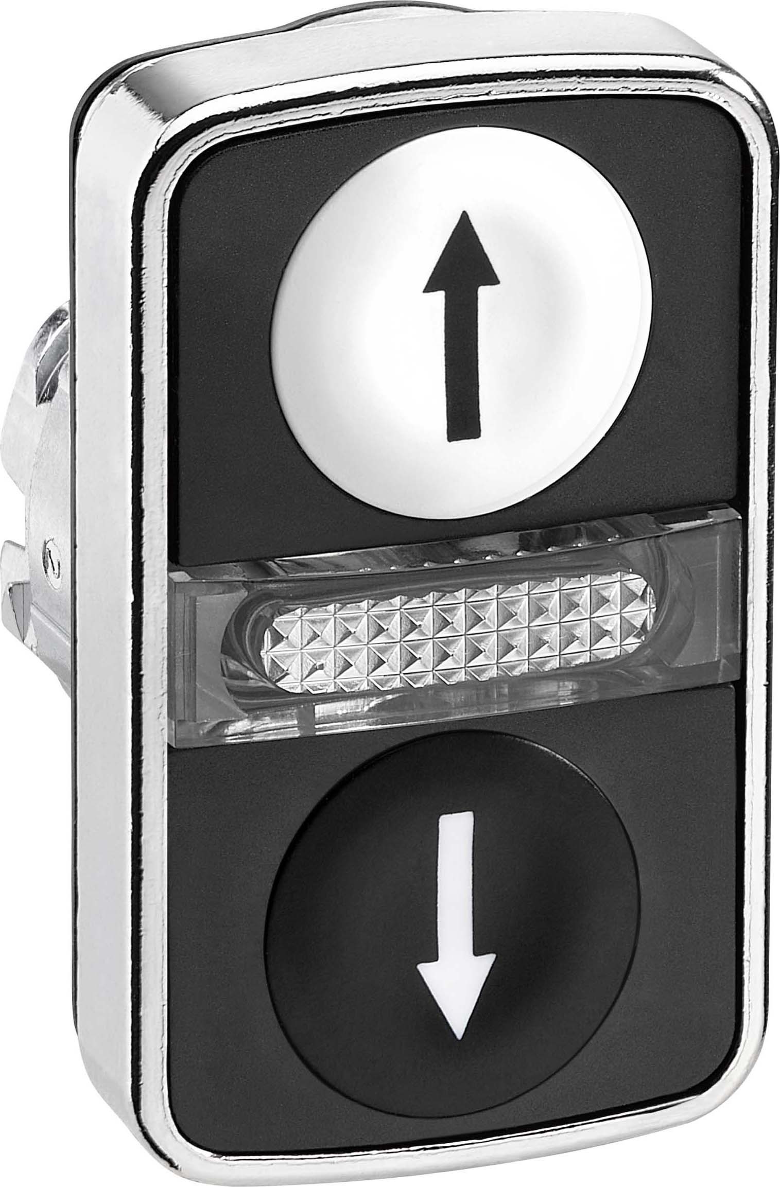 4 Die Baureihe Harmony XB4/ZB4 aus Metall bietet eine Vielzahl an 22mm und 30mm Befehls- und Meldegeräten wie Drucktaster, Leuchtmelder und Wahlschalter bis hin zum Not-Aus-Schalter. Durch den modularen Aufbau der Geräte ist es möglich, alle Bestandteile als Einzelelemente, in Baugruppen oder als Komplettgeräte zu beziehen. Aufgrund der Qualität, der Flexibilität und der extremen Robustheit (Schutzklassen bis IP69K) eignen sich die Geräte ideal für die meisten Anwendungen in der Industrie und in Gebäuden. Dieses ergonomische Doppeldrucktaster Frontelement in den Farbe schwarz und weiß ist beschriftet mit Pfeil oben/unten und beleuchtet. Das Frontelement wird in einer Bohrung von 22mm montiert. Die Befestigung erfolgt durch eine erschütterungsfeste Anschlussschraube. Um ein vollständiges Komplettgerät zu schaffen, kann dieses Frontelement mit einem Befestigungsflansch sowie einer Vielzahl an verschiedenen Hilfsschaltern und Zubehör kombiniert werden. Neben hoher Vibrationsbeständigkeit und sehr langer Lebensdauer bestechen die Geräte der Baureihe XB4/ZB4 zusätzlich durch eine extrem hohe mögliche Umgebungstemperatur. Aufgrund der Vielzahl von vorhandenen Produktstandards und Zertifizierungen geeignet für den internationalen Einsatz. Dank des Green Premium Umweltzeichens können Sie detaillierte Informationen zu Materialinhalten, Umweltauswirkungen und Kreislaufwirtschaft erhalten, die Ihre Nachhaltigkeitsziele unterstützen.