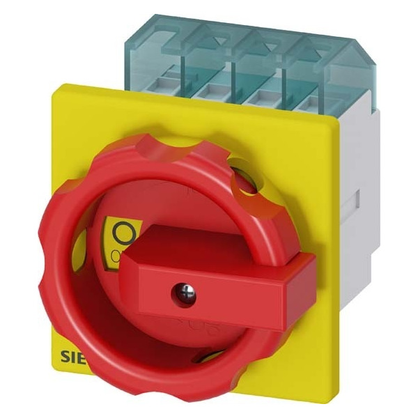 SENTRON, Lasttrennschalter 3LD, Not-Aus-Schalter, 4- polig, Iu: 16 A, Betriebsleistung / bei AC-23 A bei 400V: 7,5 kW, Frontbefestigt, Drehantrieb, rot/gelb, 4-Loch Befestigung der Handhabe Der Haupt- und Not-AUS-Schalter 3LD als Reparaturschalter für eine sichere Abschaltung von Lasten in unterschiedlichsten Umgebungen. Die Einsatzmöglichkeiten der Netztrenneinrichtungen 3LD sind vielfältig. Nach Netztrennungen sorgen sie für die sichere Freischaltung der gesamten elektrischen Ausrüstung, schalten so zum Beispiel Drehstrommotoren, aber auch Klima- und Lüftungsanlagen. 3LD haben sich in vielen Bereichen bewährt, insbesondere in Be- und Verarbeitungsmaschinen des Maschinen- und Förderanlagenbaus, in der chemischen oder in der Nahrungsmittel- und Getränkeindustrie. Die Siemens Haupt- und Not-AUS-Schalter 3LD zeichnen sich vor allem aus durch: 1. Modularer Aufbau, schnelle einfache Montage von Hilfsschaltern, N- PE-Klemme oder 4. Pol. 2. Vielseitig und weltweit einsetzbar dank internationaler IEC-, UL-, sowie Schiffbau Approbationen. 3. Schutzart bis IP 65 mit gekapseltem Gehäuse für Anwendungen im Freien. 4. Für Gleichstromanwendungen einsetzbar. 5. Montagearten: Frontbefestigung, Montageplatte, Hutschiene. 6. Optimale Netztrennung von 16 A bis 250 A durch Abschließbarkeit des Drehantriebes.