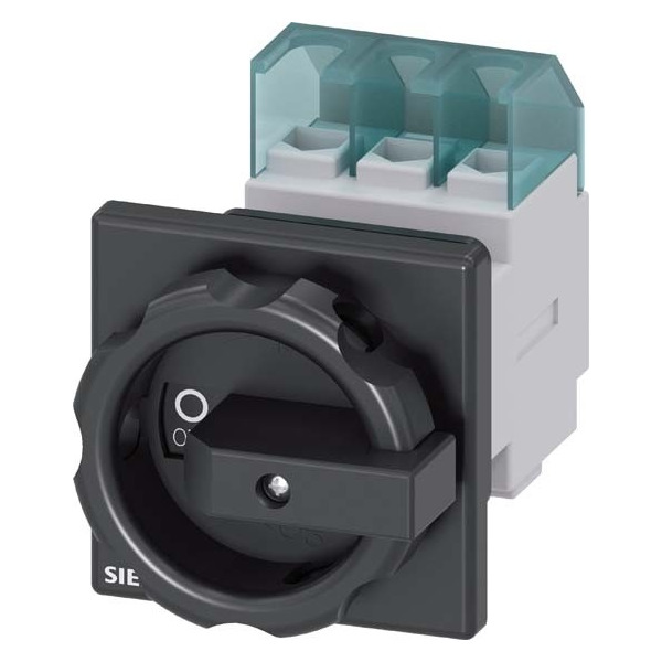 SENTRON, Lasttrennschalter 3LD, Hauptschalter, 3-polig, Iu: 32 A, Betriebsleistung / bei AC-23 A bei 400V: 11,5 kW, Frontbefestigt, Drehantrieb, schwarz, Zentralbefestigung 22,5mm der Handhabe Der Haupt- und Not-AUS-Schalter 3LD als Reparaturschalter für eine sichere Abschaltung von Lasten in unterschiedlichsten Umgebungen. Die Einsatzmöglichkeiten der Netztrenneinrichtungen 3LD sind vielfältig. Nach Netztrennungen sorgen sie für die sichere Freischaltung der gesamten elektrischen Ausrüstung, schalten so zum Beispiel Drehstrommotoren, aber auch Klima- und Lüftungsanlagen. 3LD haben sich in vielen Bereichen bewährt, insbesondere in Be- und Verarbeitungsmaschinen des Maschinen- und Förderanlagenbaus, in der chemischen oder in der Nahrungsmittel- und Getränkeindustrie. Die Siemens Haupt- und Not-AUS-Schalter 3LD zeichnen sich vor allem aus durch: 1. Modularer Aufbau, schnelle einfache Montage von Hilfsschaltern, N- PE-Klemme oder 4. Pol. 2. Vielseitig und weltweit einsetzbar dank internationaler IEC-, UL-, sowie Schiffbau Approbationen. 3. Schutzart bis IP 65 mit gekapseltem Gehäuse für Anwendungen im Freien. 4. Für Gleichstromanwendungen einsetzbar. 5. Montagearten: Frontbefestigung, Montageplatte, Hutschiene. 6. Optimale Netztrennung von 16 A bis 250 A durch Abschließbarkeit des Drehantriebes.
