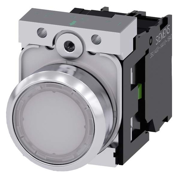 Leuchtdrucktaster, 22 mm, rund, Metall, hochglanz, weiß, Druckknopf, flach, tastend, mit Halter, 1S, LED-Modul mit integrierter LED AC/DC 24V, Schraubanschluss Leuchtdrucktaster SIRIUS ACT zur Schaltung und Steuerung elektrischer Verbraucher.Unter dem Markennamen SIRIUS ACT bietet Siemens ein einzigartiges Portfolio an Befehls- und Meldegeräten mit weltweiten Produkt-Zulassungen in vier modernen Designreihen aus robustem Echtmetall und hochwertigem Kunststoff.Das innovative Aufschnappkonzept vereinfacht die Montage so weit, dass dafür nur eine Hand und kein Spezialwerkzeug erforderlich ist. Als Montagebohrungen genügen nutfreie Löcher, da bereits ein 100%iger Verdrehschutz integriert ist.Dank der durchgängig hohen Schutzart sind die robusten Geräte industrietauglich und für den Außeneinsatz geeignet. Sogar die Reinigung mit Hochdruckstrahl ist möglich. Weder Staub, Öle noch aggressive Laugen können den zuverlässigen Betrieb stören.Neben der Standardverdrahtung können die meisten Geräte auch über PROFINET, AS-Interface oder IO-Link an die Steuerung angebunden werden. Damit reduzieren Sie Ihren Verdrahtungsaufwand, minimieren Fehlerquellen und gewinnen mehr Flexibilität.Komfortabel unterstützt der grafische Online-Konfigurator bei Auswahl und Bestellung von Einzelgeräten, Gehäusen und Beschriftungen. Umfangreiche Dokumentation (z.B. Handbuch, 3D-Daten, Anschlussdiagramm) ist verfügbar.Lieferbare Ausführungen: mehrere Farben, beleuchtet/unbeleuchtet, mit/ohne Beschriftung, verrastende/tastende Betätigung, verschiedene Druckknopf- und Frontringhöhen.Hinweis: Komplettgerät, Lieferung inklusive Halter und Module.SIRIUS ACT - Performance in Action beim Befehlen und Melden. Einfach montiert, einfach stark, einfach perfekt.
