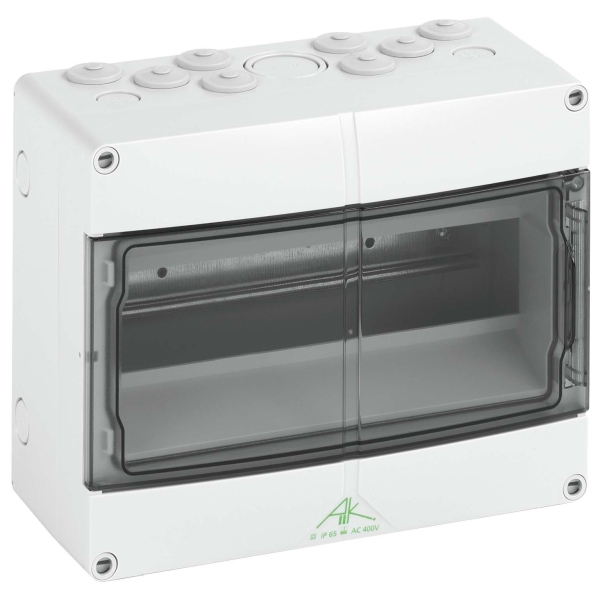 Kleinverteiler, mit Schutzart IP65, 1-reihig, 12 verfügbare Teilungseinheiten, Bemessungsbetriebsspannung: 400V AC, Bemessungsisolationsspannung: 1000V AC, 1000V DC, oben und unten metrische Vorprägungen für universelle Leitungseinführungen mit Kabelverschraubungen und / oder Doppelmembranstutzen, oben mit elastischen Einführungen DMS M20 vorbestückt, mit PE/N-Klemmschiene mit jeweils 2 Klemmstellen 16mm² und 10 Klemmstellen 6mm²