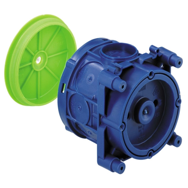 Deckenverbindungsdose, 4 Schraubdome mit Schraubabstand 60mm, mit M5 Gewindebuchse (Traglast 10kg) zur Aufnahme eines Deckenhakens, kombinierbar im Normabstand 71mm, vollisolierter Leitungsübergang, geeignet für alle Schalungsarten und Gegenschalung, mit Schutzart IP30, Bemessungsisolationsspannung: 400V AC, halogenfrei, Magnet- oder Nagelbefestigung, Membran zur Lochung, Dichtbereich M16-M25, stützholmfähig