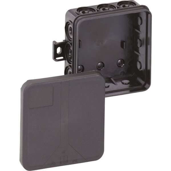Abzweigdose, mit Schutzart IP55, Nennquerschnitt 2,5mm², Ui=400V AC, zertifiziert durch VDE (DIN EN 60670-1/-22 (VDE 0606-1/-22)), selbstdichtende Einführungsmembranen, Dichtbereich 8,2-12,5mm, (3 rückseitig, 12 seitlich), innenliegende Befestigungsstellen, für Standardinstallationen im Innenbereich, schwarz, ohne Klemmen