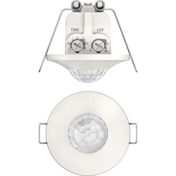 Präsenzmelder für Deckeneinbau, Erfassungsbereich rund, automatische helligkeitsabhängige Steuerung für Beleuchtung, Mischlichtmessung, Helligkeitswerte und Ausschaltverzögerung einstellbar, Fernbedienbar und manuelles Ein- und Ausschalten möglich