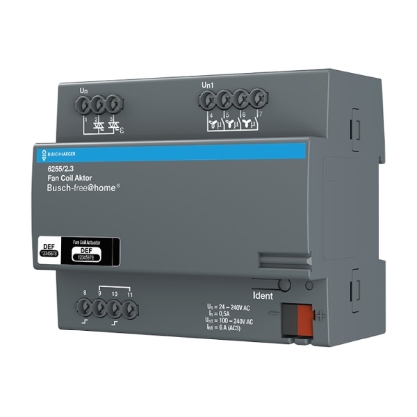A0027 Fan Coil-Aktor für Busch-free@home®. Zur Steuerung von Gebläsekonvektoren. Unterstützt 2-Rohr- und 4-Rohrsystem zum Heizen und Kühlen. Die Lüfterstufen können über eine Wechsel- oder Stufenschaltung geschaltet werden. Drei Kontakte zum Schalten eines dreistufigen Lüfters. Zwei Kontakte für die Ansteuerung der Heiz- und Kühlventile. Unterstützt 24V und 230V Ventile. Mit zwei Binäreingängen zum Anschluss von Taupunkt und Kondensatkontakten. Die Abfragespannung wird durch das Gerät zur Verfügung gestellt. Der Busanschluss erfolgt über die beiliegende Busklemme. Es wird keine zusätzliche Inbetriebnahme-Software benötigt. Programmierung nur bei angelegter Busspannung über das Web-Interface des System Access Points. Produktreihe: Busch-free@home®