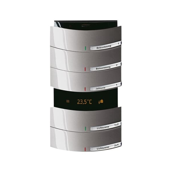A0061 Mit integriertem KNX-Busankoppler. Mit Beschriftungsfeld. Tasterfunktion (Schalten/Dimmen/Jalousie/Wert senden/Lichtszenen/Lüftungsfunktion) Master-/Slavebetrieb. Mit Grundlastbetrieb. Bedienelement mit Raumtemperaturreglerfunktion zur Ansteuerung von Heizungs-, Lüftungs- und Fan Coil Aktoren. Der Regler ist ein stetiger Raumtemperaturregler für Ventilator-Konvektoren (Fan Coil) in 2- und 4-Rohr Anlagen und konventionellen Heiz- oder Kühlanlagen Die Lüfterstufe kann manuell oder in den Automatikbetrieb geschaltet werden Zur Ansteuerung durch Busch-Ferncontrol® IR-Handsender 6010-25 bzw. 6020-.../6021... . Klasse des Temperaturreglers: 1 Beitrag zur Raumheizungsenergieeffizienz: 1,0%. Bei Bedarf entnehmen Sie bitte die programmierbaren Funktionen aus der aktuellen Applikationsbeschreibung die Sie von unserer Internetseite www.busch-jaeger.de herunterladen können. Passende Beschriftungssoftware unter www.BUSCH-JAEGER-Beschriftungstool.de.