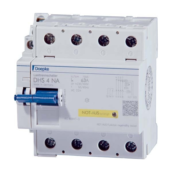 Lastrenn- bzw. Hauptschalter trennen elektrische Verbraucher oder Anlagenteile vollständig und allpolig von der elektrischen Versorgung. Sie schalten auch unter Last oder Überlast. Sie werden zur Abschaltung für Wartungsarbeiten und zum Anlagenschutz eingesetzt. Die Geräte der Baureihe DHS 4 sind Lasttrenn- bzw. Hauptschalter in vierpoliger Ausführung bei denen der N-Kontakt voreilend eingeschaltet und nacheilend ausgeschaltet wird. Durch ihre Bauart fügen sie sich hervorragend in die Optik der Fehlerstromschutzschalter DFS ein. DHS mit NOT-AUS-Funktion ermöglichen den Anschluss einer NOT-AUS-Einrichtung, wie z. B. Taster. Eine integrierte LED signalisiert die Auslösung durch ein Betätigungselement oder durch Drahtbruch. Eine Wiedereinschaltung wird bis zur Behebung verhindert.