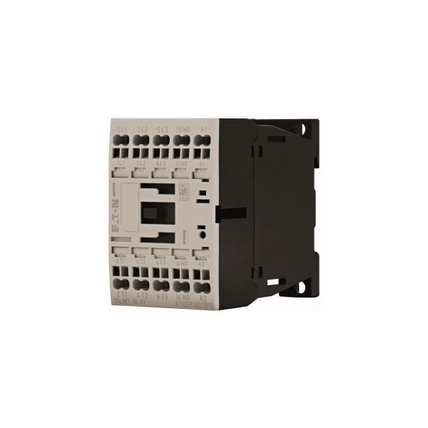 Leistungsschütz für Motoren, Leistungsschütze bis 170 A, 3-polig, Gebrauchskategorie: AC-1: Nicht induktive oder schwach induktive Last, Widerstandsöfen, AC-3/AC-3e: Käfigläufermotoren: Anlassen, Ausschalten während des Laufes, AC-4: Käfigläufermotoren: Anlassen, Gegenstrombremsen, Reversieren, Tippen, Anschlusstechnik: Push-in-Klemmen, Geeignet auch für Motoren der Effizienzklasse IE3, Anzahl der Pole: 3-polig, Bemessungsbetriebsstrom AC-3 380 V 400 V: Ie= 7 A, Bemessungsbetriebsstrom AC-1 konventioneller thermischer Strom, 3-polig, 50 - 60 Hz offen bei 40 °C: Ith = Ie= 22 A, gekapselt: Ith= 18 A, Bemessungsbetriebsstrom AC-1 konventioneller thermischer Strom 1-polig offen: Ith= 50 A, gekapselt: Ith= 45 A, max. Bemessungsbetriebsleistung Drehstrommotoren 50 - 60 Hz AC-3 220 V 230 V: P= 2.2 kW, 380 V 400 V: P= 3 kW, 660 V 690 V: P= 3.5 kW, max. Bemessungsbetriebsleistung Drehstrommotoren 50 - 60 Hz AC-4 220 V 230 V: P= 1 kW, 380 V 400 V: P= 2.2 kW, 660 V 690 V: P= 2.9 kW, kombinierbar mit Hilfsschalter: DILM12-XHI-PI, DILM32-XHI-PI, DILA-XHI(V)-PI, Kontaktbestückung S = Schließer: 1 S, Schaltglieder nach EN 50012., Stromart AC/DC: Gleichstrombetätigung