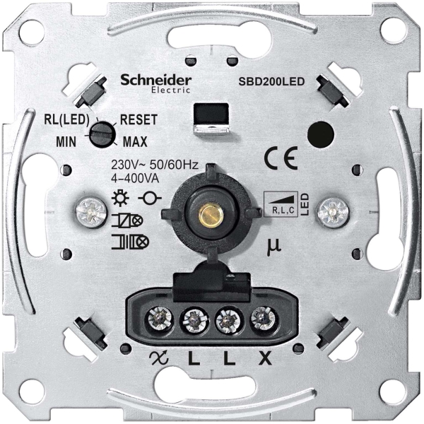 Universaldimmer-Einsatz fuer LED 4-400W. Der Universal-Dimmer erkennt automatisch die angeschlossene Last. Keine Mischlasten anschließen. Mit Druck-Wechselschalter. Mit Krallen- und Schraubbefestigung. Mit Schraubklemmen. Nennspannung: AC 230 V~, 50 Hz. Schaltleistung:. LED Lampen: 4-200 VA (RC-Modus). 4-40 VA (RL-LED-Modus). Glühlampen: 4-400 W. Halogenlampen: 4 bis 400 W (230 V). 4 bis 400 VA (NV mit dimmbarem gewickeltem Trafo). 4bis 400 VA (NV mit dimmbarem elektronischem Trafo). Neutralleiter: nicht erforderlich. Anschlussklemmen: Schraubklemmen für max. 2,5 mm2. Absicherung: 16 A-Leitungsschutzschalter. Eigenschaften: -kurzschlussfest. überlastfest. überhitzungsfest. Softstart. automatische Lasterkennung. Min. / Max. Begrenzung einstellbar. Betriebsart RL-LED-Modus einstellbar. Typ: SBD200LED. Hinweis: Informationen zum Thema Dimmen von LED Leuchtmitteln erhalten Sie im Internet unter Schneider-Electric Dimmertest. http://schneider-electric.dimmer-test.com.