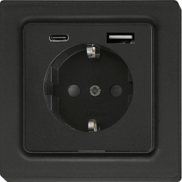 Deutsche Schutzkontakt-Steckdose DSS mit Steckdosen-Oberteil und USB-Adapter im E-Design55, 80x80mm außen, Rahmen-Innenmaß 55x55mm. Mit erhöhtem Berührungsschutz. Das Steckdosenunterteil hat Schraubklemmen. Einbautiefe 38mm. Integriertes USB-Netzteil 5V DC/2,8A mit Kurzschluss- und Überlastschutz. Intelligente Parallelnutzung beider USB-Anschlüsse.