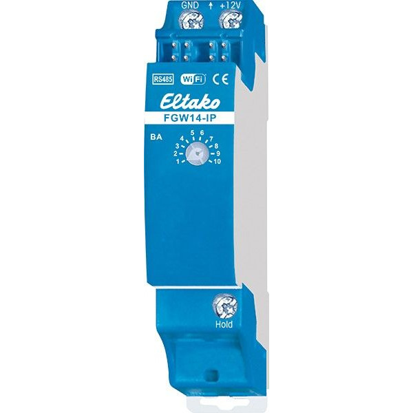 Gateway mit IP-Schnittstelle für Baureihe 14-Stromzähler über WLAN oder LAN. Bidirektional. Stand-by-Verlust nur 0,8 Watt. Reiheneinbaugerät für Montage auf Tragschiene DIN-EN 60715 TH35. 1 Teilungseinheit = 18mm breit, 58mm tief. Das Gateway ist nur 1 TE breit: Für den Betrieb muss das Gateway in ein WLAN oder LAN eingebunden werden. Die WLAN-Verbindung nutzt das 2.4 GHz Frequenzband. Die LAN-Anbindung erfolgt per RJ45-Stecker mit 10/100Base-T. Anschluss an den Eltako-RS485-Bus. Querverdrahtung Bus und Stromversorgung mit Steckbrücke. Betrieb in Verbindung mit FAM14 oder FTS14KS. Die Hold-Klemme wird mit dem FAM14 oder FTS14KS verbunden. Die IP-Verbindung erfolgt über LAN oder WLAN. Das Gateway überträgt Daten von beliebigen Eltako-Stromzählern am RS485-Bus über das MQTT-Protokoll. Die Daten werden vom RS485-Bus an einen beliebigen externen MQTT-Broker übertragen. Für mehr Details zu MQTT siehe: www.mqtt.org. Die Daten sind gemäß dem Enocean over IP-Format codiert, siehe: www.enocean-alliance.org/specifications/ Konfigurationen und Updates erfolgen über die Eltako Connect-App. Eine REST-API steht über die Online-Produktseite des Gerätes zur Verfügung.