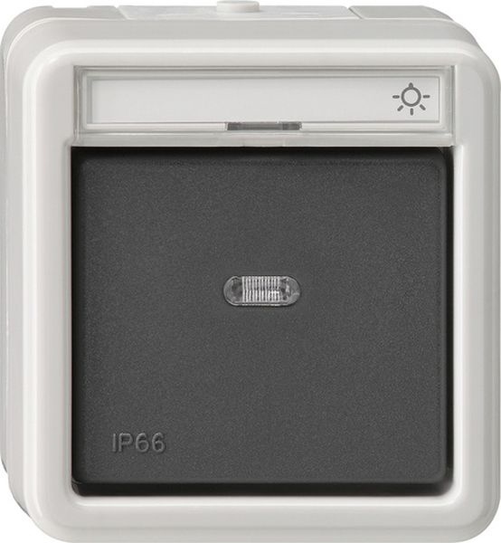 Wipptaster 10 A 250 V~ mit Beschriftungsfeld Grau Wechsler 1-polig Auch beleuchtbar anzuschließen. Blanko Beschriftungsschild liegt bei. Beschriftungsschilder mit Symbolen Licht, Klingel und Tür liegen bei.