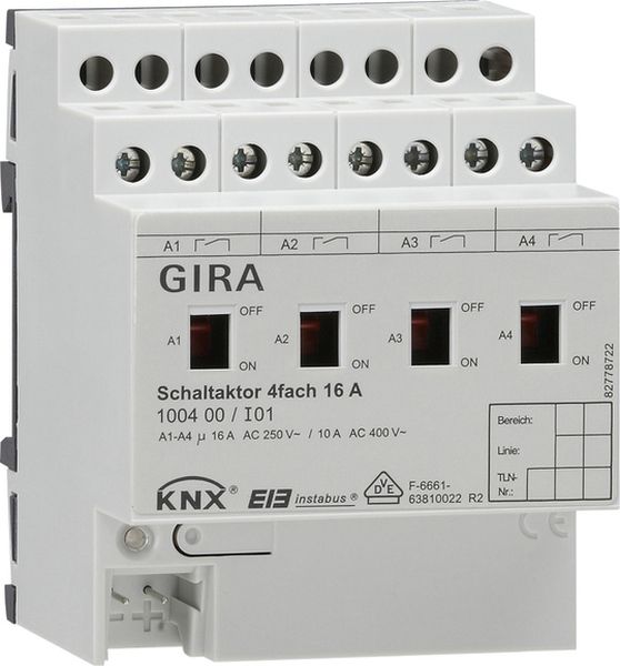 Schaltaktor 4fach 16 A mit Handbetätigung für KNX Merkmale: Handbetätigung der Relais unabhängig vom Bus bzw. der Schaltstellungsanzeige. Schließer- oder Öffnerbetrieb. Zentrale Schaltfunktion. Sammelrückmeldung zur Reduzierung der Buslast. Aktive oder passive (Objekt auslesbar) zyklische Rückmeldefunktion. Rückmeldungen lassen sich nach Busspannungswiederkehr verzögern. Logische Verknüpfungsfunktion für jeden Ausgang. Sperrfunktion für jeden Kanal parametrierbar. Alternativ Zwangsstellungsfunktion für jeden Ausgang. Zeitfunktionen (Ein- bzw. Ausschaltverzögerung, Treppenlichtfunktion - auch mit Vorwarnfunktion). Einbeziehung in Lichtszenen möglich, max. acht interne Szenen je Kanal sind parametrierbar. Speicherfunktion für Lichtszenen. Betriebsstundenzähler als Vorwärts-/Rückwärtszähler mit Grenzwertfunktion (Grenzwert über Bus veränderbar) für jeden Ausgang aktivierbar. Eingangsüberwachung auf zyklische Aktualisierung mit Sicherheitsstellung. Reaktionen bei Busspannungsausfall und -wiederkehr und nach einem ETS-Programmiervorgang für jeden Kanal einstellbar. Unabhängiges Schalten der vier Ausgänge. Hinweise: Montage auf DIN-Hutschiene. VDE-Zulassung gemäß EN 60669-1, EN 60669-2-1. Lieferumfang: Anschluss- und Abzweigklemme für KNX im Lieferumfang enthalten.