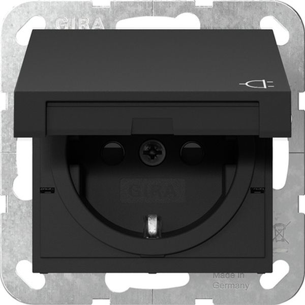 SCHUKO-Steckdose 16 A 250 V~ mit Klappdeckel und erhöhtem Berührungsschutz (Safety Plus) Schwarz matt (lackiert) System 55 Merkmale: Tragring ist in Verbindung mit den Befestigungskrallen und Krallenschrauben geerdet. Schnellbefestigung (ca. 3,5 Umdrehungen pro Befestigungskralle). Eingehauste Spreizkrallen. Einfachere Krallenbefestigung durch robusten Schraubenkopfantrieb PZ1 / Schlitz / PH. Vereinfachte Installation durch patentierte Anordnung der großen Schlüssellochprofile mittels Dosenschrauben. Geringe Einbautiefe. Große, ergonomisch geformte Lösehebel. Stabiler Erdungsbügel mit massiven Erdungsfingern. Stabiler und korrosionsbeständiger Stahltragring. Bruchsicherer Thermoplastsockel. Hinweise: Abdeckrahmen (1- bis 5fach) aus den Schalterprogrammen Standard 55, Gira E1 und Gira E2 in Verbindung mit dem Dichtungsset auch für die Montage von Unterputz-SCHUKO-Steckdosen mit Klappdeckel wassergeschützt IP44 geeignet. Erhöhter Berührungsschutz (Safety Plus) gemäß DIN VDE 0620-1. Lieferumfang: