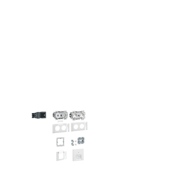 SET 1 Arbeitsplatz mit 3 Std+USB-Charger 15W 2xRJ45 Cat.6A Frontrastend vw.Geräteeinbauset für Brüstungskanal mit Frontrastender Gerätemontage, zur Versorgung eines Büroarbeitsplatzes mit Strom und Netzwerk, bestehend aus Steckdose 1-fach mit USB Ladesteckdose Typ A+C 15 W (5 V/3 A), Steckdose 2-fach, Eingangsbuchse für Installationssteckverbindersystem, zwei Steckdosenblenden 2-fach je mit und ohne integriertem Beschirftungsfeld, Gerätedose zur Aufnhame von Kommunikationsanbschlussdosen, Kommunikationsanschlussdose 2-fach Kategorie 6A geschirmt, Rahmenblende 55 modular mit integriertem Beschriftungsfeld sowie Zentralscheibe 55 UAE 2-fach.