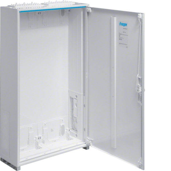 Zählerschrank, univers Z, 950x550x205 mm, Schutzklasse II, 144 Platzeinheiten.Schrankgehäuse nach DIN VDE 0603-1, Maßnorm DIN 43870 zur Aufputz, Unterputz oder teilversenkter Montage. Zum Aufbau einer Zählerverteileranlage bis 355 A, Bemessungsspannung 230/400 V 50 Hz. Schutzart IP31 (IP44/IP54 nach DIN VDE 0470-1), Schutzklasse II schutzisoliert, Schutzart IP3X hinter der Tür. Bestehend aus Schrank mit Tür aus pulverbeschichtetem, eingebranntem, stabil profiliertem 1 mm dickem Stahlblech. Innenauskleidung komplett aus Kunststoff. Leitungseinführungen oben und unten durch eingebaute Kunststoffflanschplatten, rückseitige Vorprägung im Kunststoffteil und seitlich eingebaute Kunststoff-Flanschplatten im Bereich des NAR (geeignet als Sammelschienendurchführung), des RfZ (nur bei Bauhöhe 1100 mm) und des AAR.Tür frontbündig mit innenliegenden, justierbaren Scharnieren, wahlweise rechts oder links anschlagbar mit 110° Öffnungswinkel. Türverschluss mit Vorreiber, ab Breite 800 mm und bei allen Schränken ab einer Höhe von 1250 mm mit Stangenverschluss mit Dreipunktschließung. Türverschluss durch andere Schließungen austauschbar. Schrank nebeneinander und übereinander anflanschbar. Schrankgröße 1- bis 5-feldrig mit 72 bis 540 Platzeinheiten (PLE).Hinweis: Bei einer Schrank-Schrank-Verbindung immer einen Verbindungssatz verwenden (Zubehör). Im AAR-Bereich kann die Kunststoff-Flanschplatten entfernt werden und optional eine SCHUKO-Steckdose oder eine CEE-Steckdose eingebaut werden.