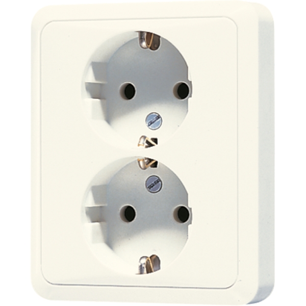 SCHUKO®-Zweifach-Steckdose, weiß für eine 60er Gerätedose mit Schraubklemmen für starre und flexible Leiter bis 2,5 mm2 Verbindungsklemmen nach DIN VDE 0620 Maße: 81 x 100 mm Material: Duroplast Maße (B x H): 67 x 67 mm