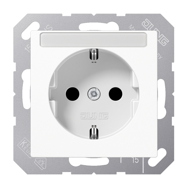 AWW SCHUKO®-Steckdose, alpinweiß mit integriertem erhöhten Berührungsschutz (Safety Plus) mit Schriftfeld 6 x 46 mm mit Federklemmen für starre und unbehandelte flexible Leiter bis 2,5 mm2 Verbindungsklemmen nach DIN VDE 0620 Tragring, Krallen und Krallenschrauben sind über eine Erdungsschiene in die Schutzmaßnahme eingebunden. Ersatzteil: Transparente Abdeckung mit Einlage Art.-Nr.: A 20 NA Material: Thermoplast Maße (B x H): 55 x 55 mm
