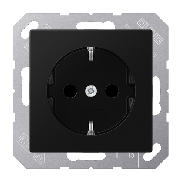 M SCHUKO®-Steckdose, graphitschwarz matt mit Federklemmen für starre und unbehandelte flexible Leiter bis 2,5 mm2 Verbindungsklemmen nach DIN VDE 0620 (Schraubbefestigung, ohne Befestigungskrallen) Tragring ist über eine Erdungsschiene in die Schutzmaßnahme eingebunden. Material: Thermoplast lackiert Maße (B x H): 55 x 55 mm