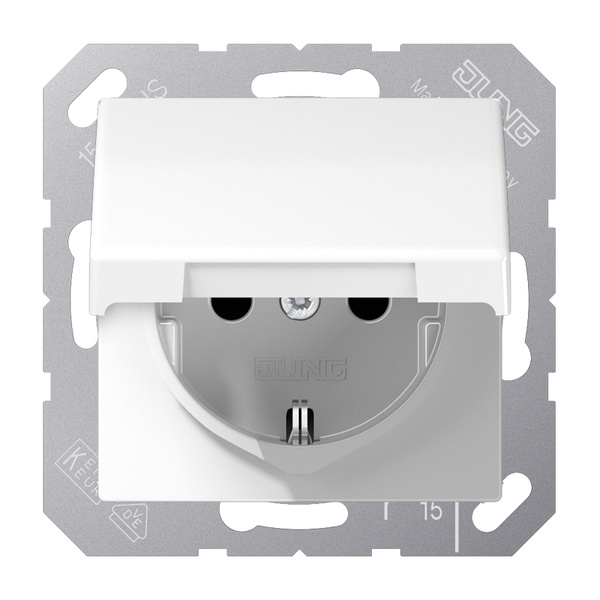 LWW SCHUKO®-Steckdose, alpinweiß mit Klappdeckel (mit Rückstellfeder) mit Federklemmen für starre und unbehandelte flexible Leiter bis 2,5 mm2 Verbindungsklemmen nach DIN VDE 0620 (Schraubbefestigung, ohne Befestigungskrallen) Tragring ist über eine Erdungsschiene in die Schutzmaßnahme eingebunden. Material: Thermoplast Maße (B x H): 55 x 55 mm