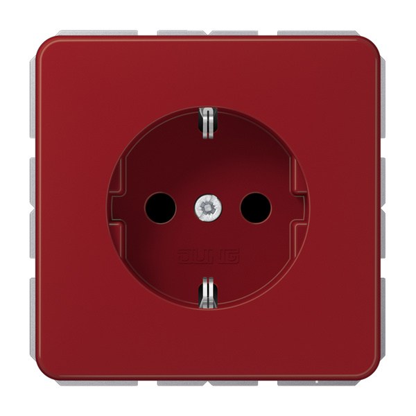 RT SCHUKO®-Steckdose, rot mit integriertem erhöhten Berührungsschutz (Safety Plus) mit Federklemmen für starre und unbehandelte flexible Leiter bis 2,5 mm2 Verbindungsklemmen nach DIN VDE 0620 Tragring, Krallen und Krallenschrauben sind über eine Erdungsschiene in die Schutzmaßnahme eingebunden. Material: Thermoplast Maße (B x H): 67 x 67 mm