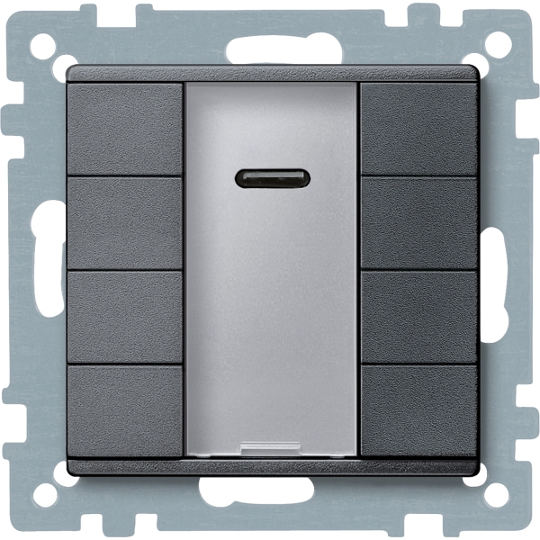 Im Design System M. Mit integriertem Busankoppler. Taster mit 8 Bedientasten, Betriebs-, Statusanzeige und Schriftfeld. Die Betriebsanzeige kann auch als Orientierungslicht verwendet werden. Die jeweiligen Funktionen der Tasten können mit einer IR-Fernbedienung angesteuert werden. Die Steuerung mit einer Merten Distance-IR-Fernbedienung ist bereits im Taster vorprogrammiert. Viele andere IR-Fernbedienungen (z. B. vorhandene TV- oder CD-Player-Fernbedienung) können am Taster angelernt werden. Das Gerät wird über eine Busanschlussklemme mit der Busleitung verbunden. Softwarefunktionen KNX: Schalten, Umschalten, Dimmen (ein-/zweiflächig), Jalousie (ein-/zweiflächig), Flanken löst 1,- 2-, 4- oder 8-Bit-Telegramme aus (Unterscheidung kurze/lange Betätigung). Flanken mit 2-Byte-Telegrammen (Unterscheidung kurze/lange Betätigung). 8-Bit-Schieberegler, Szenenabruf, Szenenspeicherung, Sperrfunktionen. Zubehör: Beschriftungsbogen für Multifunktions-Taster mit IR-Empfänger 6184xx.Lieferumfang: Mit Putzschutzhaube. Mit Busanschlussklemme. Material: Thermoplast edelmatt. Farbe: anthrazit.