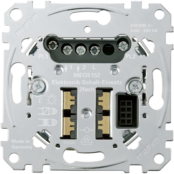 00 Für ohmsche oder induktive Lasten wie Glühlampen und NV-Halogenbeleuchtung mit konventionellem Trafo. Mit Krallen- und Schraubbefestigung. Mit Schraubklemmen. Funktionen: -Schalten von zwei Ausgängen. Es wird durch das Modul die Art und Weise festgelegt, wie die Funktion des Einsatzes genutzt wird. Externe Ansteuerung über zwei PlusLink Eingänge. Überlast- und kurzschlussfest. Nennspannung: AC 220/230 V, 50/60 Hz. Ausgänge: 2. Schaltleistung pro Kanal: 50-220 VA. Neutralleiter: nicht erforderlich (2 Leitersystem). Anschlussquerschnitt: max. 2x2,5 mm². Zu komplettieren mit: Taster-Modul Basic, 1fach System M MEG5110-0300, System Design MEG5110-60xx Taster-Modul Basic, 2fach System M MEG5120-0300, System Design MEG5120-60xx. Taster-Modul Comfort, 1fach System M MEG5111-0300, System Design MEG5111-60xx Taster-Modul Comfort, 2fach System M MEG5121-0300, System Design MEG5121-60xx Taster-Modul Comfort Plus mit IR, 1fach System M MEG5112-0300. Taster-Modul Comfort Plus, 2fach System M MEG5122-0300. Wiser Taster-Modul, 1fach System M MEG5113-0300, System Design MEG5113-60xx Wiser Taster-Modul, 2fach System M MEG5123-03xx, System Design MEG5123-60xx. Drehregler-Modul System M MEG5252-03xx/-04xx ARGUS 180 UP Sensor-Modul System M MEG5710-03xx/-04xx, System Design MEG5710-60xx ARGUS 180 UP Sensor-Modul mit Schalter System M MEG5711-03xx/-04xx, System Design MEG5711-60xx. ARGUS Präsenz 180/2,20 m UP Sensor-Modul System M MEG5530-03xx/-04xx ARGUS Präsenz Sensor-Modul mit IR MEG5522-00xx Zeitschaltuhr-Modul Standard System M MEG5754-03xx/-04xx. Zeitschaltuhr-Modul System M MEG5755-03xx/-04xx, System Design MEG5755-60xx. Sender: Nebenstelle Plus, 1fach System M MEG5119-0300, System Design MEG5119-60xx Nebenstelle Plus, 2fach System M MEG5129-0300, System Design MEG5129-60xx Zentralstellen-Einsatz MEG5190-0000. Zubehör: PlusLink Verteiler (3 Phasen) MEG5130-0001. PlusLink-Erweiterung MEG5130-0000.