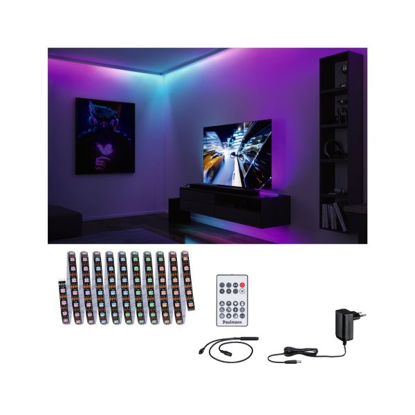 Das LED Strip Set Dynamic Rainbow RGB in 3m Länge schafft ein besonderes Ambiente im Home-Entertainment und im Gaming Bereich. Mit seinem angenehm, ruhig wechselnden, dynamischen Farbspiel lassen sich effektvolle Lichtakzente setzen. Die komfortable Steuerung per Infrarot-Fernbedienung ermöglicht eine kinderleichte Konfiguration von unzähligen eigenen Farbverläufen und Geschwindigkeiten. Die sehr kleinen Komponenten können ohne Werkzeug Plug & Play verbunden werden und mit dem beiliegenden Netzteil sofort in Betrieb genommen werden. Die Memory-Funktion speichert die zuletzt verwendete Stufe bis zum nächsten Einschalten Komplettset inkl. Strip, Power Supply und Fernbedienung Nach Längenbedarf kürzbar (an markierten Stellen) Farbwechsel RGB