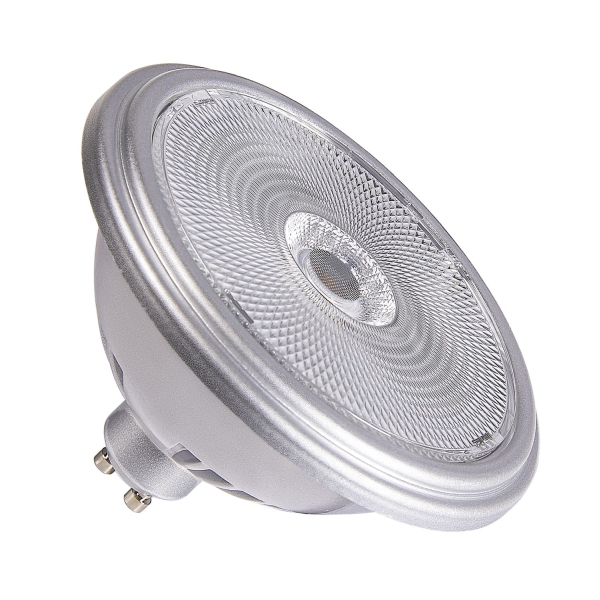 Das silberne 12,5 W SLV COB LED Leuchtmittel mit GU10 Sockel und QPAR111 Form ist dimmbar, hat einen einen CRI -Wert von 90, 1.000 Lumen sowie eine Lebensdauer von 25.000 Stunden. Diese Version hat einen Abstrahlwinkel von 60° und und hat 3.000 Kelvin.