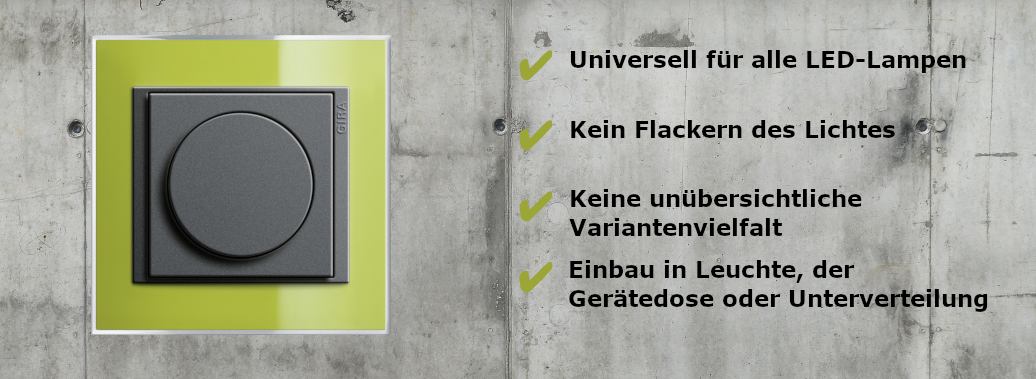 Somit stellt der Dimmer eine universelle Komplettlösung für Ihre LED-Beleuchtung dar. Stell rechtzeitig um und setze auf bewährte Gira-Technik.